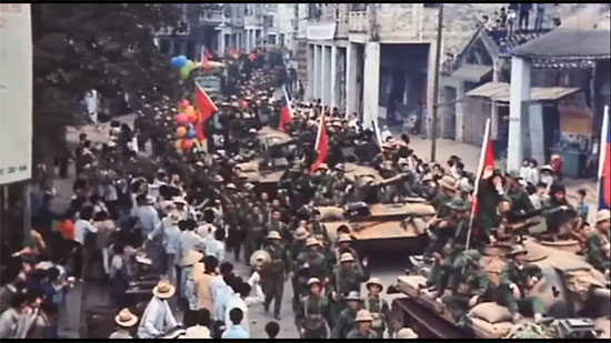 The film opens after North Vietnam unified South Vietnam, with columns of tanks rolling through the streets. Akutagawa is among the crowd, taking photographs. The camera pans to reveal soldiers atop the tanks, onlookers lining the streets, and people waving from upper floors. Returning to a medium shot, the military vehicles recede into the distance. Akutagawa, absorbed in his photography, notices a disabled child with a crutch. He follows the child into an alleyway to capture his silhouette, only to be startled by cheers: another convoy of tanks and military vehicles approaches.