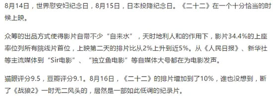 Interestingly, this “comeback” has left the film’s promoters with mixed feelings. They worry that “Twenty Two” might be treated as a short-lived product for national sentiment, when it’s better suited for a steady, long-term approach.